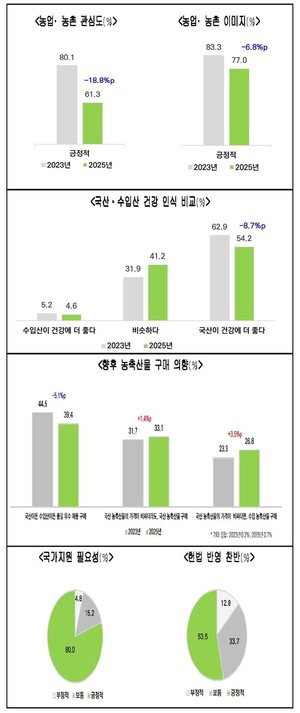 【뉴스퀘스트=김민수 기자】농업·농촌에 대한 관심도가 예전보다 크게 떨어지면서 농업 가치 확산을 위한 헌법이 필요하다는 주장이 제기됐다.20일 농협중앙회(회장 강호동) 미래전략연구소는 ‘2025년 농업・농촌 도시민 인식 조사’ 결과를 발표했다. 이번 조사는 7개 특·광역시 거주하는 성인 남녀 1084명을 대상으로 한국갤럽에 의뢰해 실시했다.그 결과, 도시민의 농업・농촌에 대한 관심도와 긍정적 이미지는 각각 61.3%, 77.0%로 지난 2023년 조사 때보다 각각 18.8%포인트, 6.3%포인트 하락한 것으로 나타났다. 특히 농촌 거