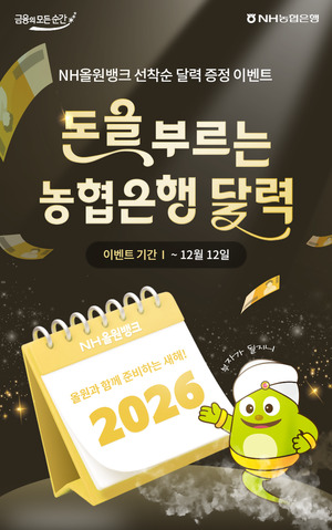 【뉴스퀘스트=이은빈 기자】 NH농협은행은 연말을 맞아 고객 성원에 보답하기 위해 다음달 12일까지 ‘2026년 농협은행 달력 증정 이벤트’를 진행한다고 25일 밝혔다.이번 이벤트는 NH올원뱅크 이벤트 페이지에서 세 가지 디자인 중 원하는 달력을 선택해 신청하면 되며, 총 2만5000명에게 선착순으로 제공된다.신청한 달력은 고객이 입력한 주소로 무료 배송된다.이벤트에 대한 자세한 사항은 NH올원뱅크 이벤트 페이지 또는 가까운 농협은행 영업점, 고객행복센터를 통해 확인할 수 있다.NH농협은행 관계자는 “새해의 풍요와 행운을 기원하는 마