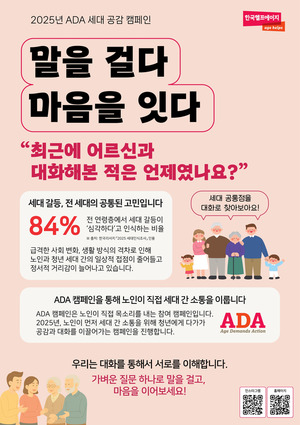 【뉴스퀘스트=최석영 기자】한국헬프에이지는 오는 10월 2일 노인의 날을 앞두고 세대 간 대화를 주제로 한 ‘2025 ADA 캠페인’을 다음달 1일~19일 진행한다고 27일 밝혔다. ADA 캠페인은 “노인은 행동을 원한다(Age Demands Action)”는 뜻으로, 매년 전 세계 60여 개국에서 열리는 헬프에이지 인터내셔널의 대표적인 국제 행사다.올해의 슬로건은 ‘말을 걸다, 마음을 잇다’로 노인들이 직접 사회에 세대 간 소통 부재의 심각성을 알리고, 거리 캠페인과 온라인 이벤트 등을 진행할 예정이다.최근 한국리서치의 ‘2025