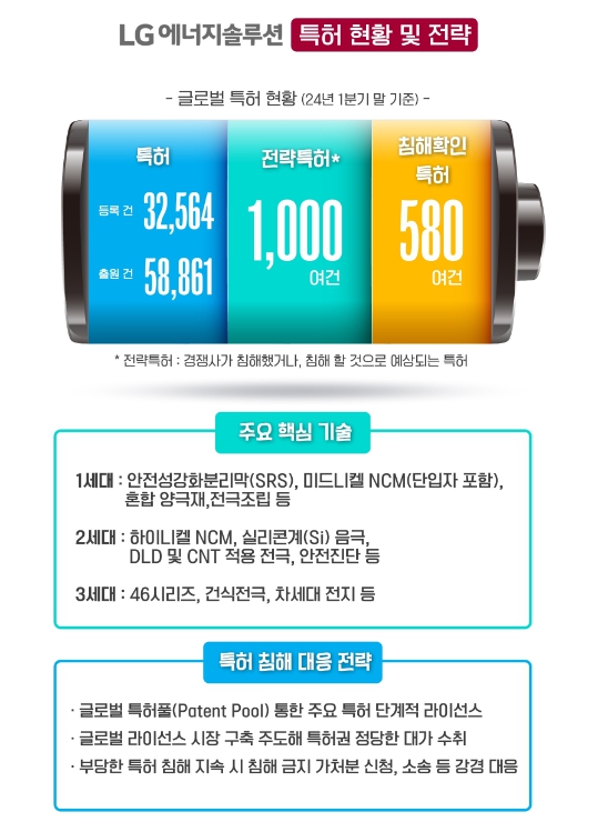 LG에너지솔루션은 불법적으로 특허를 사용하는 기업들에게는 소송 및 경고 등을 통해 강경하게 대응하는 한편, 글로벌 배터리 특허 라이선스 시장을 조성해 배터리 산업의 공정한 경쟁 환경을 선도해 나가기로 했다고 24일 밝혔다.
