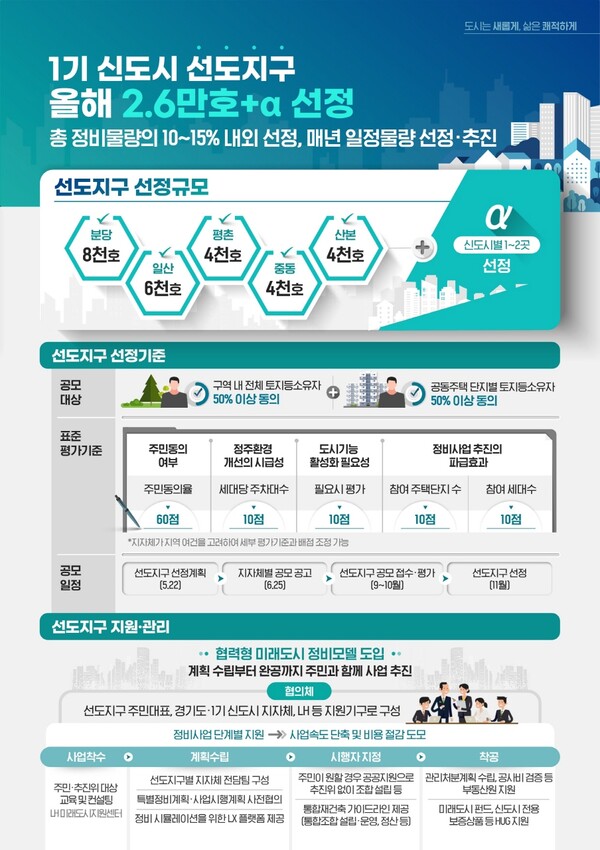 1기 신도시 각 지자체는 특별정비구역(안)과 선도지구 선정 기준, 동의서 양식 및 동의서 징구 방식 등 공모 지침을 오는 6월 25일에 확정·공고함으로써 선도지구 공모를 시작한다.