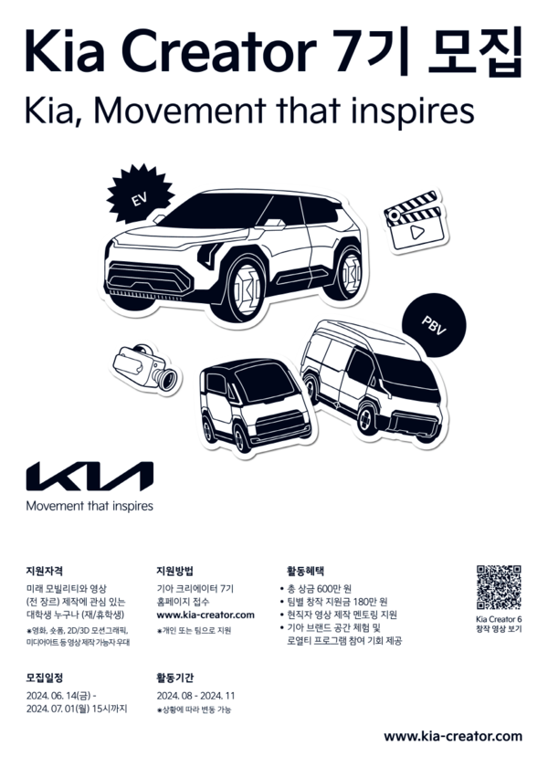 지원 신청은 14일부터 7월 1일까지 기아 크리에이터 홈페이지를 통해 진행되며, 서류 전형과 면접을 거쳐 최종 합격자를 선발할 계획이다.