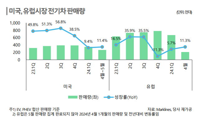 실제 미국과 유럽에서의 전기차 시장을 살펴보면 판매량과 성장률 모두 전년 대비 감소한 것으로 나타났다.