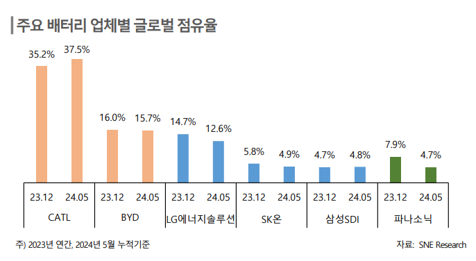 시장조사업체 기관 'SNE 리서치'에 따르면 배터리 글로벌 점유율(지난 5월 기준) 1위와 2위는 중국의 배터리 업체 'CATL'(37.5%)과 'BYD'(15.7%)였으며 이들이 과반을 차지하고 있다.