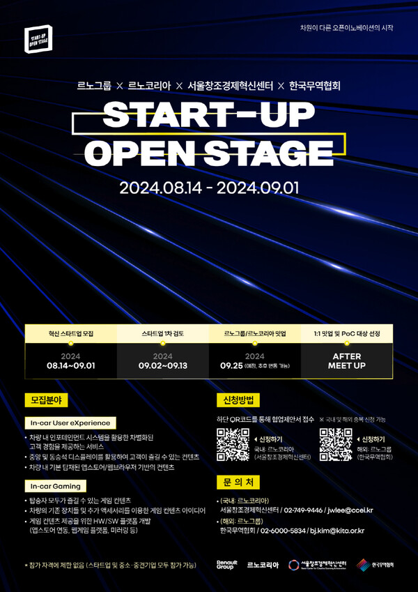 ‘2024 스타트업 오픈스테이지’는 르노코리아와 서울창조경제혁신센터가 함께하는 국내 트랙, 르노 그룹과 한국무역협회가 함께하는 글로벌 트랙으로 구성된다.