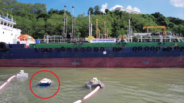 이날 SK이노베이션은 스타트업 쉐코가 개발한 유회수기 로봇을 투입해 방제훈련을 진행했다.