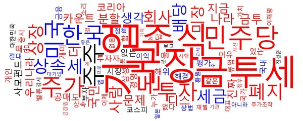 이번 분석에서 영상과 뉴스를 모두 합쳐 다수 언급된 단어는 ▲기업 ▲주식 ▲국장 ▲금투세 ▲민주당 ▲돈 ▲투자 등이었다.