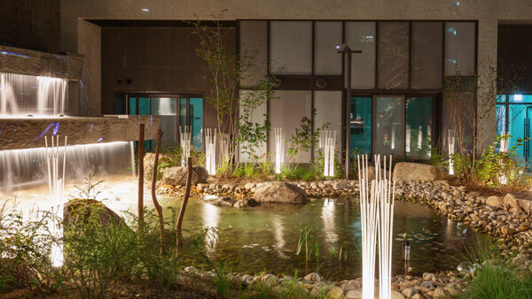 단지 내 수공간 ‘워터플라자’에 적용된 경관조명은 물결과 수목이 예술작품처럼 표현되도록 연출했다. 또 시간에 따라 적절한 조도를 구현하여 단지 내 조성된 자연을 편안한 분위기 속에서 감상 수 있도록 계획했다.