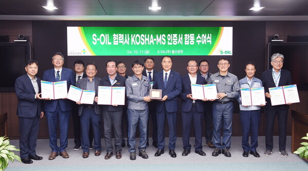 【뉴스퀘스트=권일구 기자 】 S-OIL은 11일 온산공장에서 올해 ‘안전보건경영시스템(KOSHA-MS)’ 구축 컨설팅을 지원해 인증을 획득한 협력업체 10개사와 함께 인증서 수여식을 가졌다고 밝혔다.