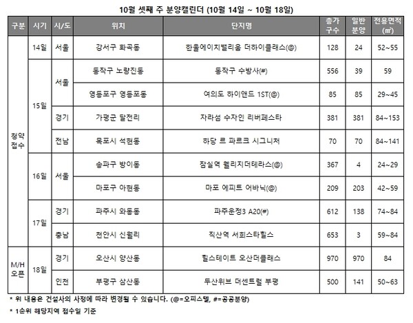 지방에서는 전남 목포시 ‘하당 르 파르크 시그니처(70가구)’, 충남 천안시 ‘직산역 서희스타힐스(조합원 취소분, 3가구) 등이 청약에 나설 예정이다.