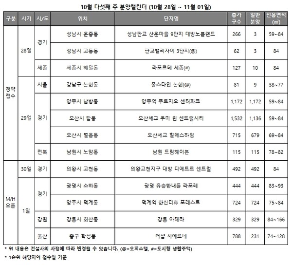 모델하우스 오픈 예정은 5곳이며 당첨자 발표는 ‘두산위브 더센트럴 부평’ 등 14곳, 정당 계약 11곳이 예정돼 있다.