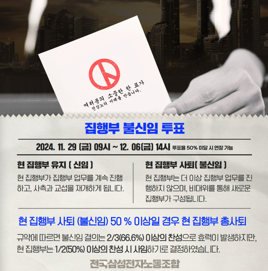 전삼노는 노조 홈페이지를 통해 오는 29일부터 내달 6일까지 집행부 불신임(사퇴) 투표를 진행한다고 22일 밝혔다.