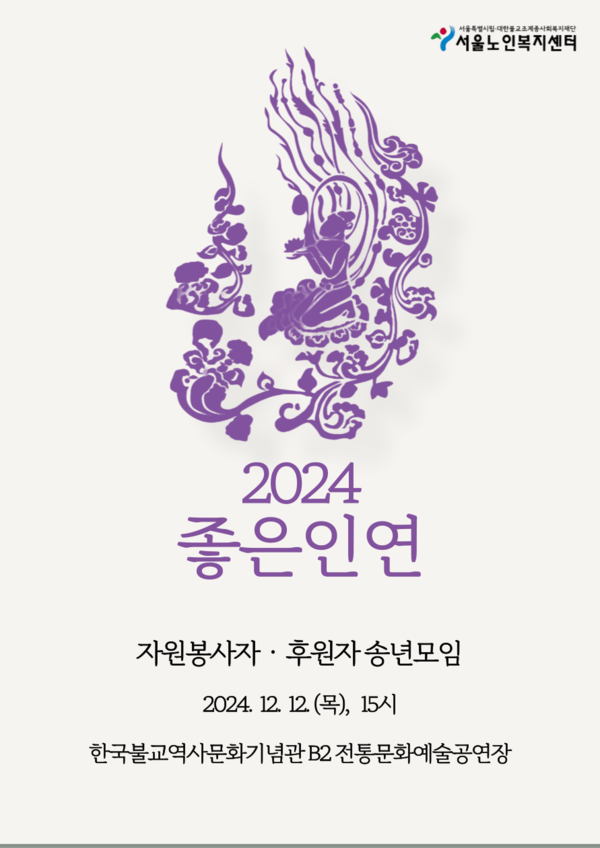 【뉴스퀘스트=최석영 기자 】 서울노인복지센터는 오는 12일 오후 3시 한국불교역사문화기념관 전통문화예술공연장에서 자원봉사자와 후원자를 위한 송년모임 ‘좋은인연’을 연다고 6일 밝혔다.
