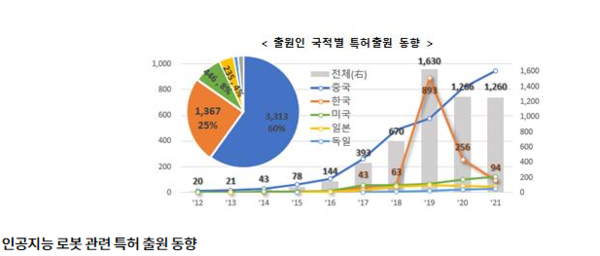 지난 10년간 가장 많은 AI 로봇 특허를 낸 국가는 중국으로 전체의 60%에 달하는 3313건을 출원한 것으로 나타났다. 2위는 한국으로 24.7%(1,367건), 3위는 미국으로 8.1%(446건)를 차지했다. 이후 일본(4.3%, 235건), 독일(1.3%, 74건) 순이었다.
