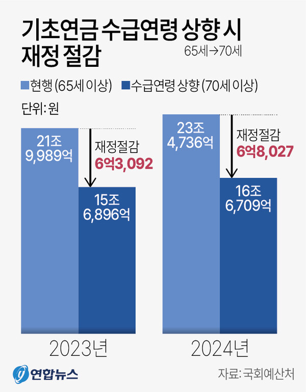 2023년 기초연금 사업의 총 지급액은 약 21조9989억원으로, 이 중 70세 이상에 지급한 총액은 15조6896억원가량에 달한다. 지급 연령 기준을 높인다면 65∼70세 구간에 지급한 6조392억원만큼 절감할 수 있다는 추산이다.