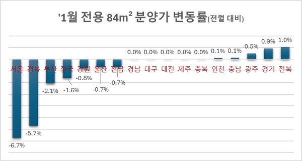 1월 말 기준 최근 1년간의 평균 전용면적별 분양 가격 변동률을 살펴보면, 59㎡는 평균 4억7691만원으로 전월 대비 1.1%(534만원) 하락했다. 또 84㎡는 평균 6억4816만원으로 1.6%(1056만원) 떨어졌다.