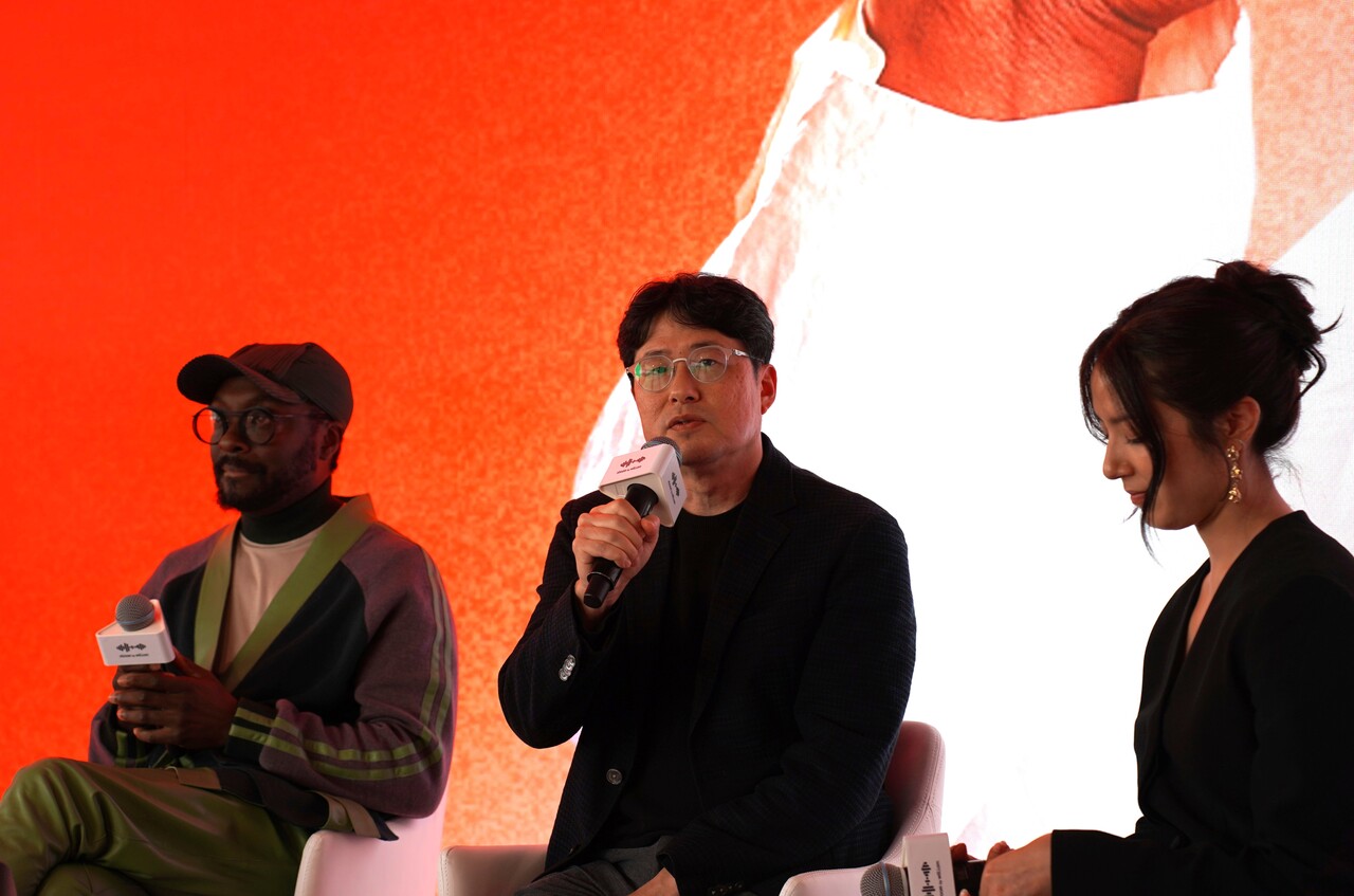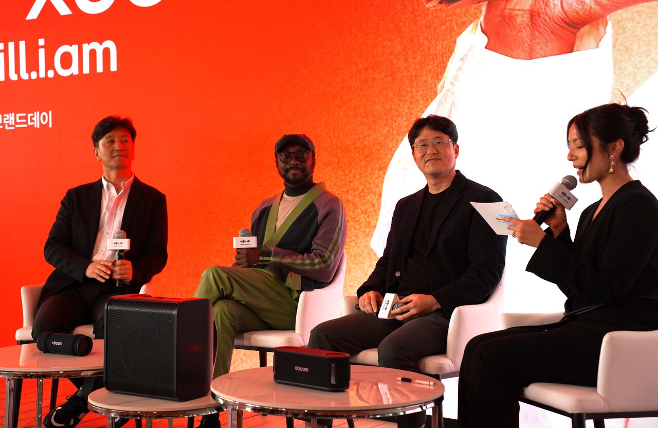 세계적인 뮤지션 윌아이엠(사진 왼쪽)이 7일 'LG 엑스붐 브랜드 데이'에서 질의에 답변하고 있다. [사진=김민우 기자]