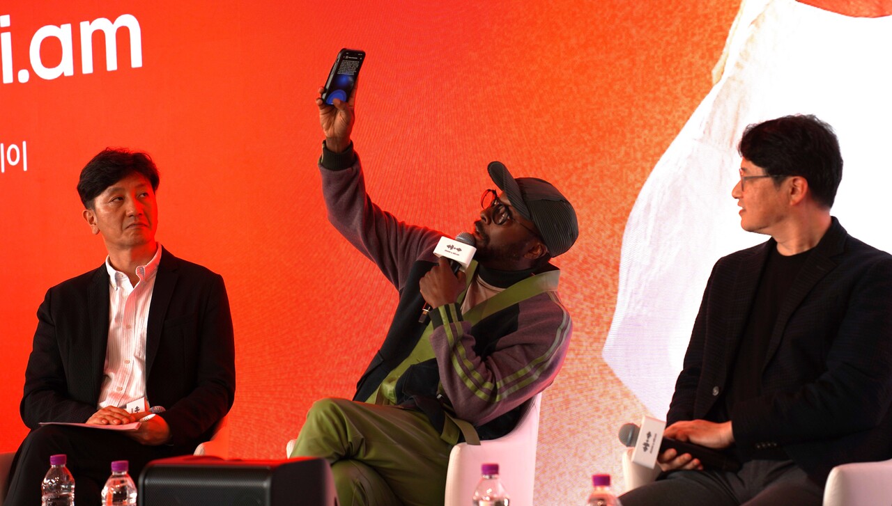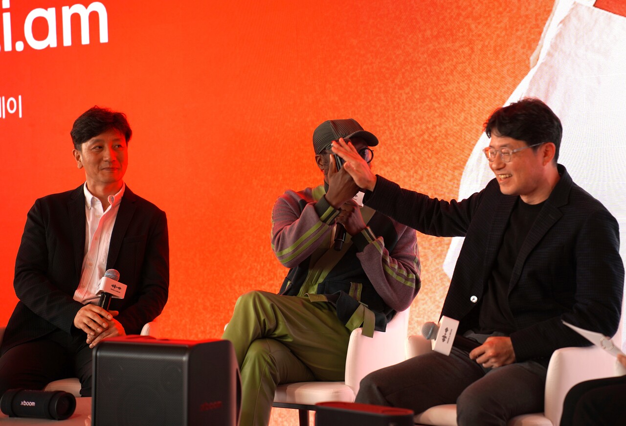 (사진 가운데) 세계적인 뮤지션 윌아이엠이 7일 'LG 엑스붐 브랜드 데이'에서 자신이 설립한 AI 기반 라디오 앱 'RAiDiO.FYI'를 선보이고 있다. [사진=김민우 기자]
