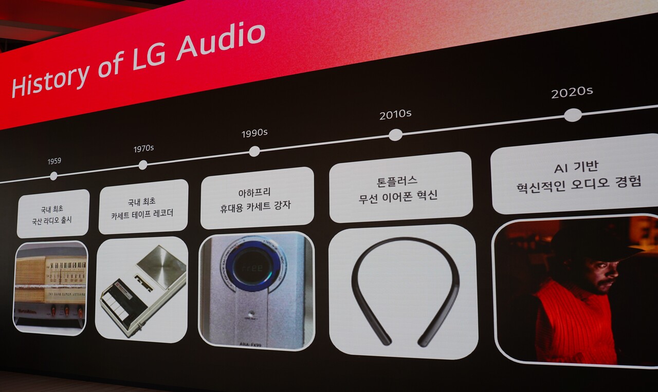 LG전자가 7일 'LG 엑스붐 브랜드 데이'에서 공개한 자사의 오디오 사업 역사 이미지. [사진=김민우 기자]