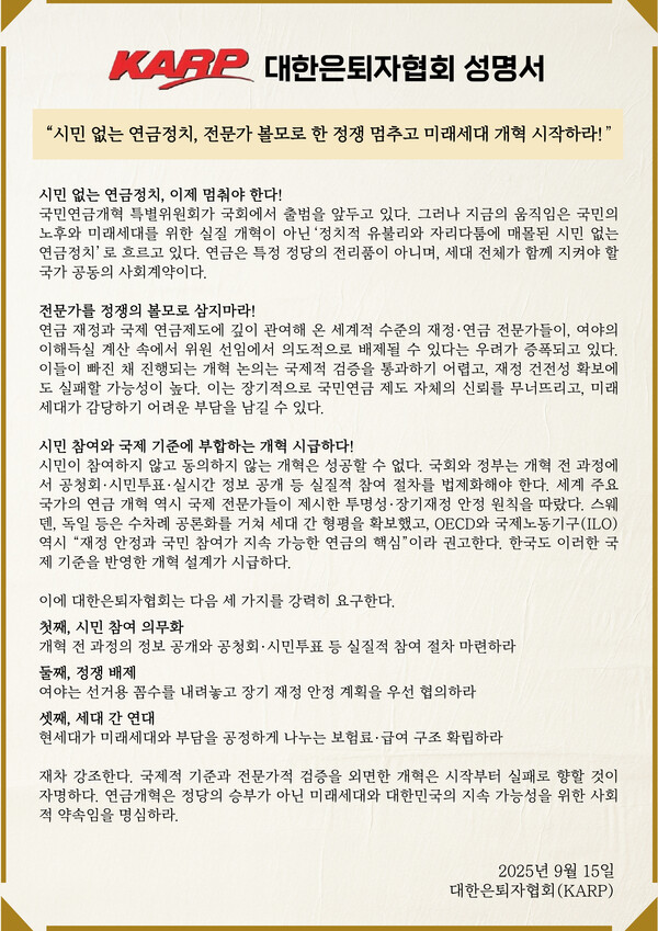 협회는 이를 두고 “국민 노후와 미래세대를 위한 실질적 개혁이 아닌, 정치적 유불리와 자리다툼에 매몰된 행태”라며 연금은 특정 정당의 전리품이 아니라 세대 전체가 지켜야 할 국가적 사회계약임을 거듭 강조했다.