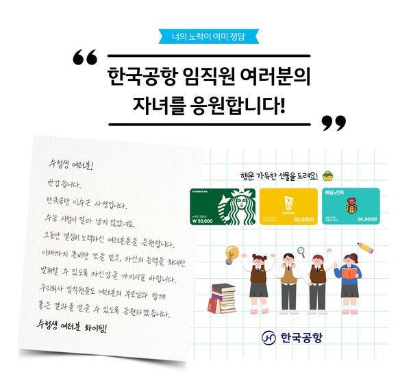 한국공항은 일가정 양립 지원과 가족친화적 기업문화 조성을 위해 지난 2019년부터 7년째 임직원 수험생 자녀 격려 선물을 이어오고 있다.